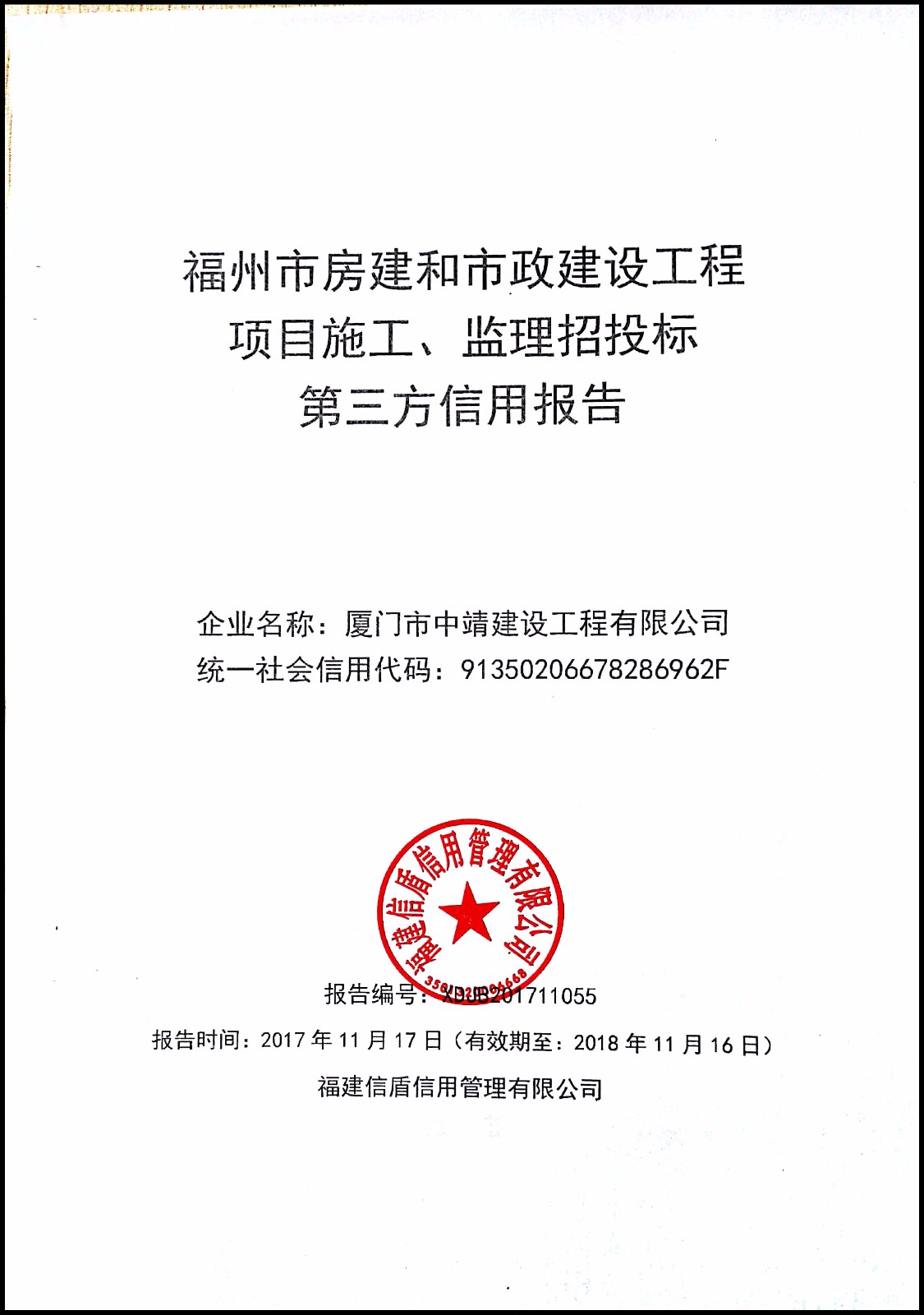 廈門市中靖建設工程有限公司 XDJB201711055
